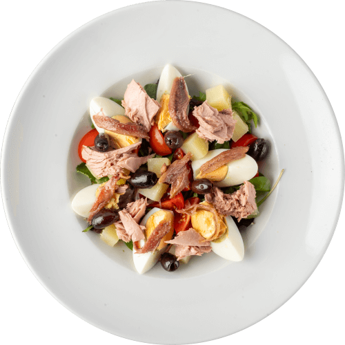 Микс салата, краставици, варени картофи, твърдо сварени яйца, риба тон, аншоа, черни маслини, червен лук.